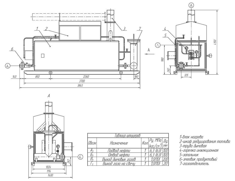 Нагреватель НУС-0,1 (ЖМ) состоит из блока нагрева, на котором при сборке изделия размещаются шкаф редуцирования топлива, газоотделитель и дымовая труба. При эксплуатации блок нагрева, шкаф редуцирования топлива и газоотделитель обвязываются по продукту и топливному газу трубопроводами нефти и газа.
