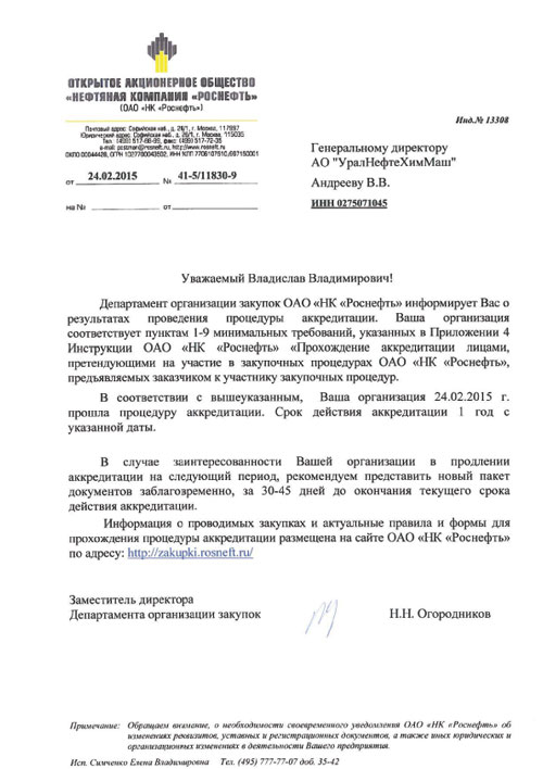 АО "Уралнефтехиммаш" 24.02.2015 г. прошла ежегодную процедуру аккредитацию в ОАО "НК "Роснефть" для участия в закупочных процедурах.