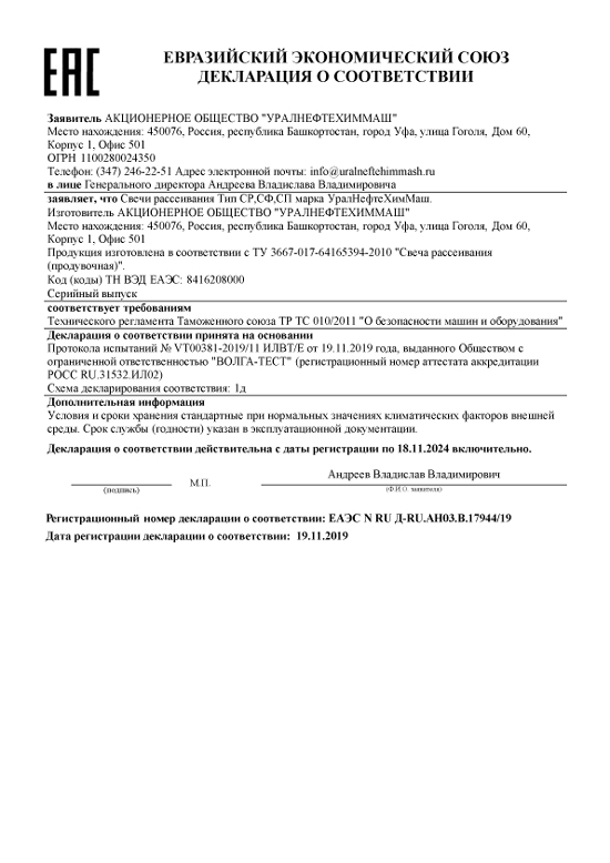 Получена обновленная ДЕКЛАРАЦИЯ О СООТВЕТСТВИИ на Свечи рассеивания Тип СР, СФ, СП марка УралНефтеХимМаш. Декларация о соответствии действительна